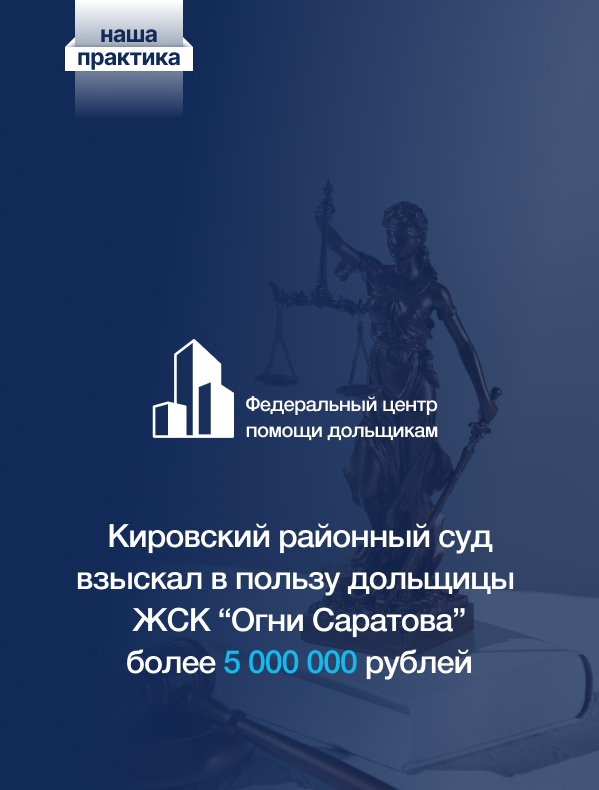 Более 5 миллионов рублей взыскал Кировский районный суд с Фонда развития территорий дочерней компании Дом.рф в пользу обманутой дольщицы. Вместо строительства многоквартирного дома ЖСК Огни Саратова направил в Фонд обращение о выплате возмещений, однако не предоставил информацию о том, что дольщица является членом кооператива и компенсацию она получить не смогла.